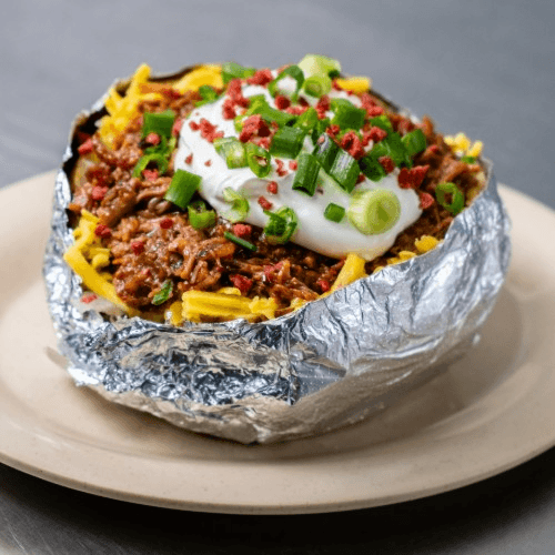 Includes butter, cheese, sour cream, green onions, bacon bits and choice of meat